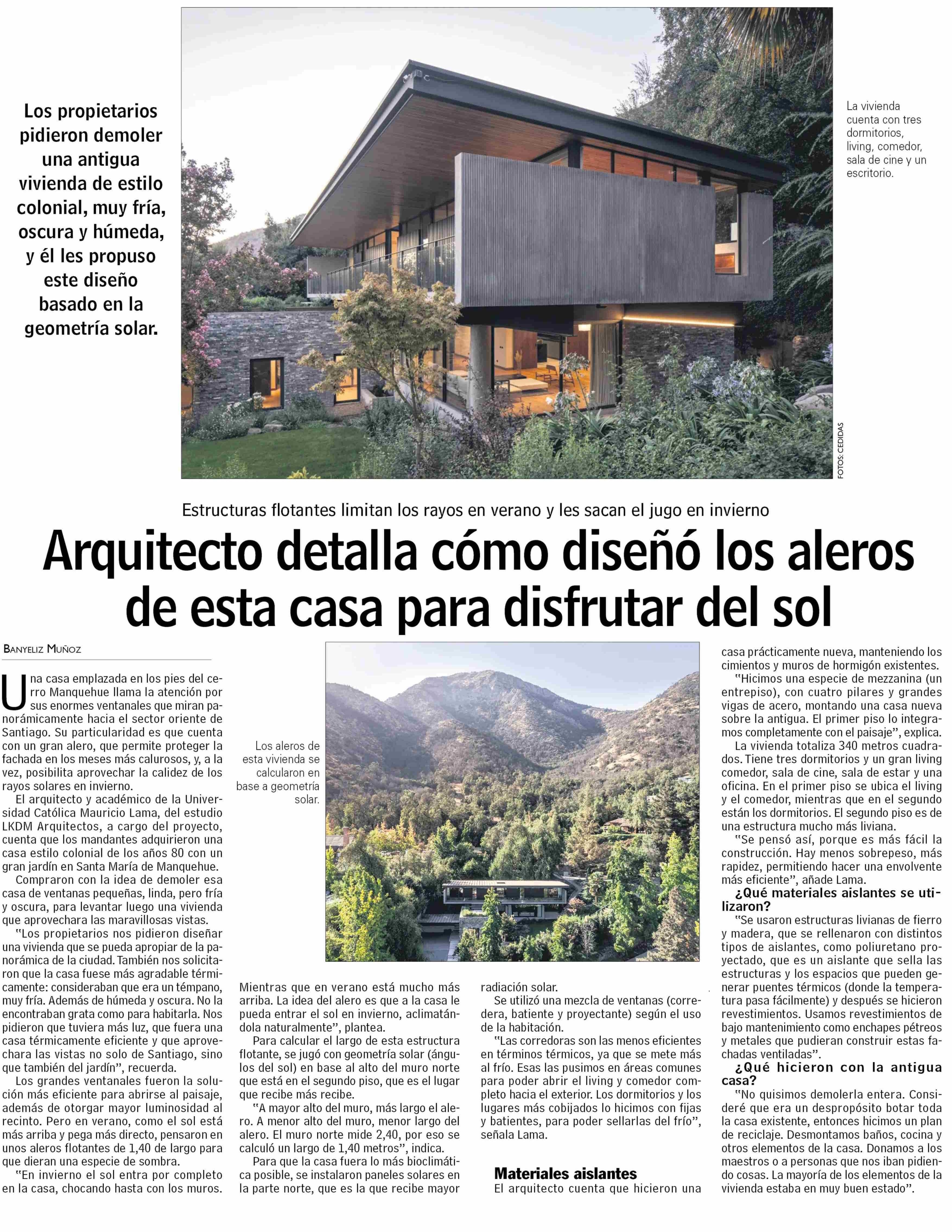 PRENSA I Arquitecto detalla cómo diseñó los aleros de esta casa para disfrutar del sol Detalles 22 Junio 2023 Visto: 266 Tweet Las Últimas Noticias destaca que académico Mauricio Lama, del estudio LKDM Arquitectos, detalla diseño basado en la geometría solar de casa emplazada en los pies del cerro Manquehue. + Revisa nota completa aquí.