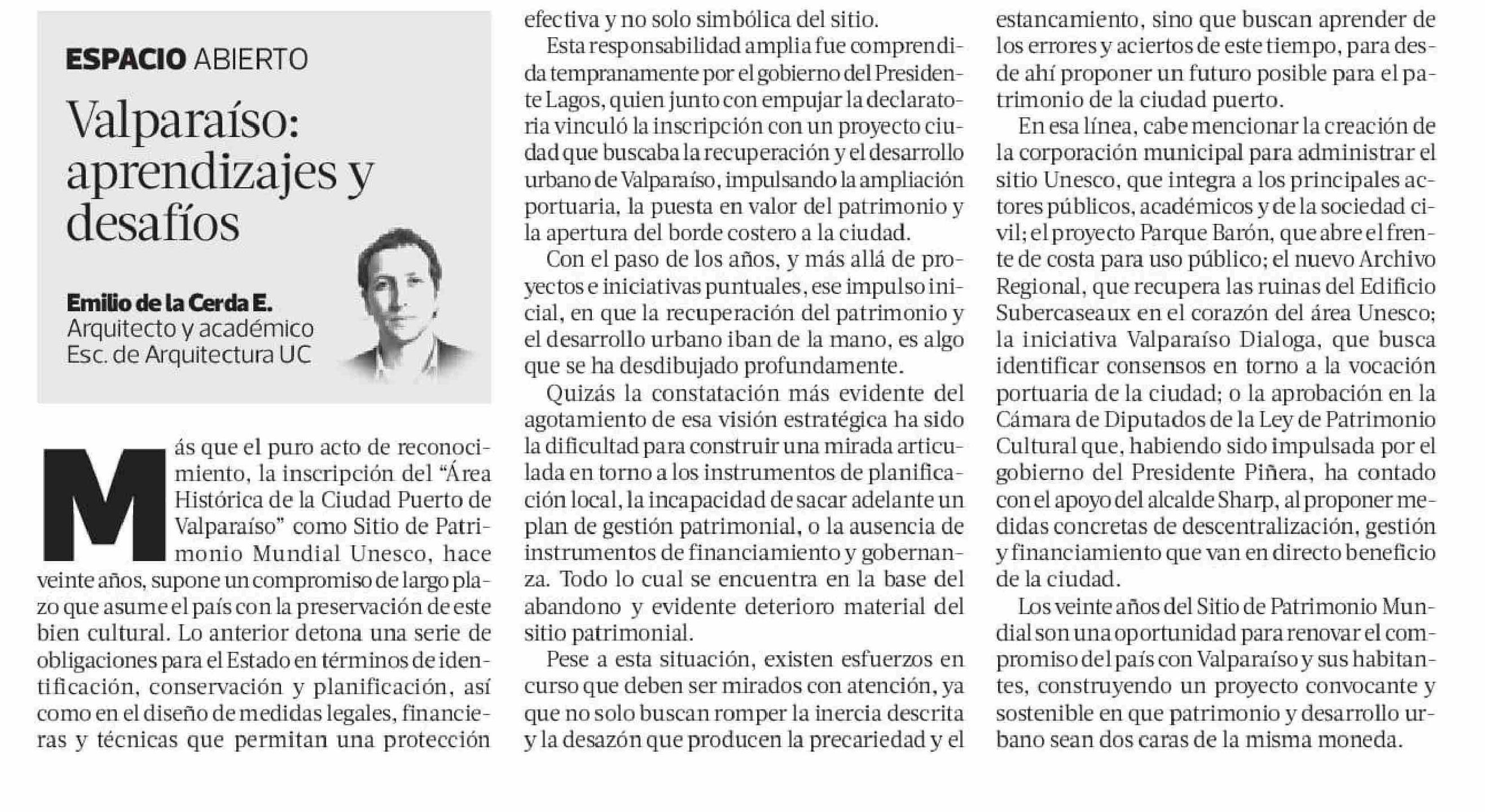 La Tercera publica columna del académico Emilio de la Cerda: "Valparaíso: aprendizajes y desafíos".