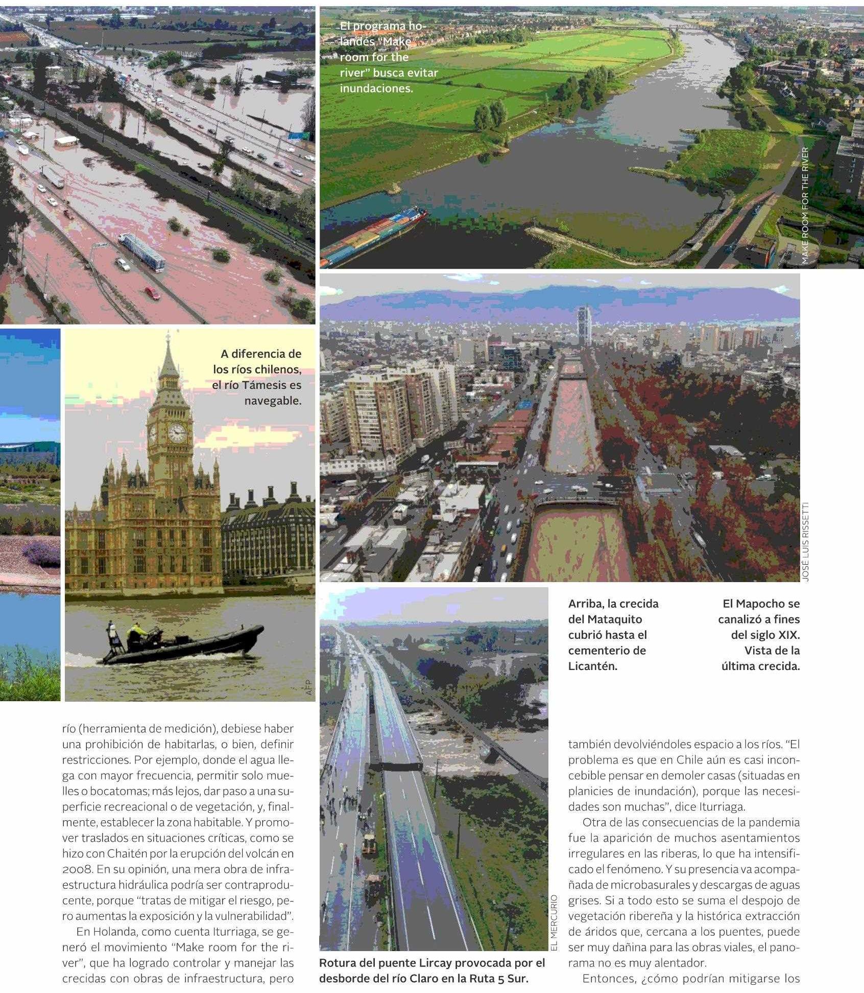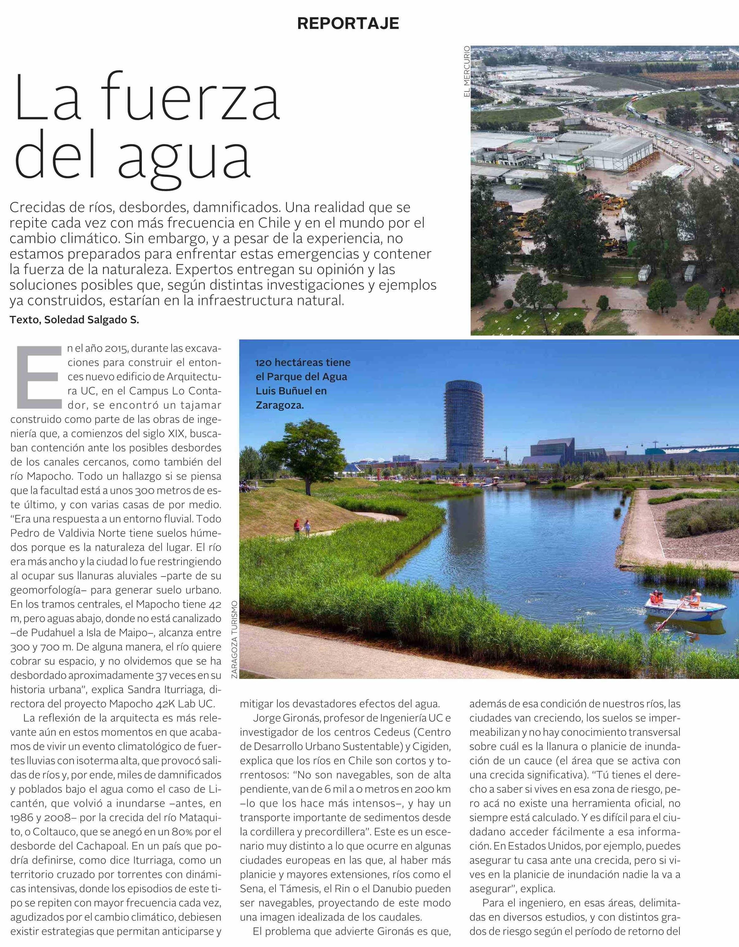Revista VD de El Mercurio destaca que expertos entregan su opinión y las soluciones posibles a las crecidas de ríos y desbordes, realidad que se repite cada vez con más frecuencia en Chile y en el mundo por el cambio climático. Habla Sandra Iturriaga, directora del proyecto Mapocho 42K Lab UC; Jorge Gironás, profesor de Ingeniería UC e investigador de los centros Cedeus (Centro de Desarrollo Urbano Sustentable) y Cigiden, y Osvaldo Moreno, académico UC y director del Laboratorio de Paisajes e Infraestructuras Verdes.