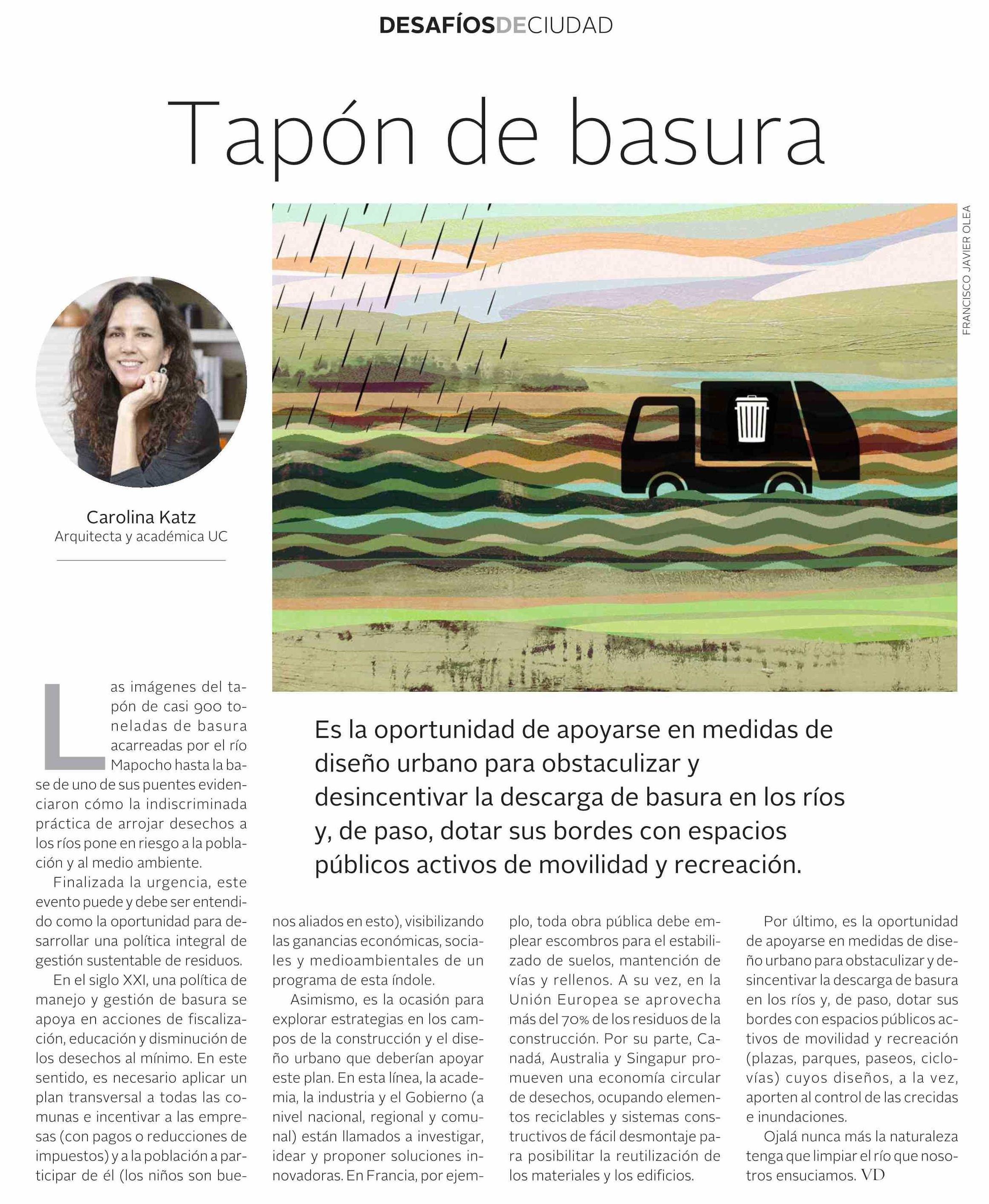 PRENSA I Tapón de basura Detalles 17 Julio 2023 Visto: 179 Tweet Revista VD de El Mercurio publica columna de la académica Carolina Katz: "Tapón de basura". + Revisa columna completa aquí.