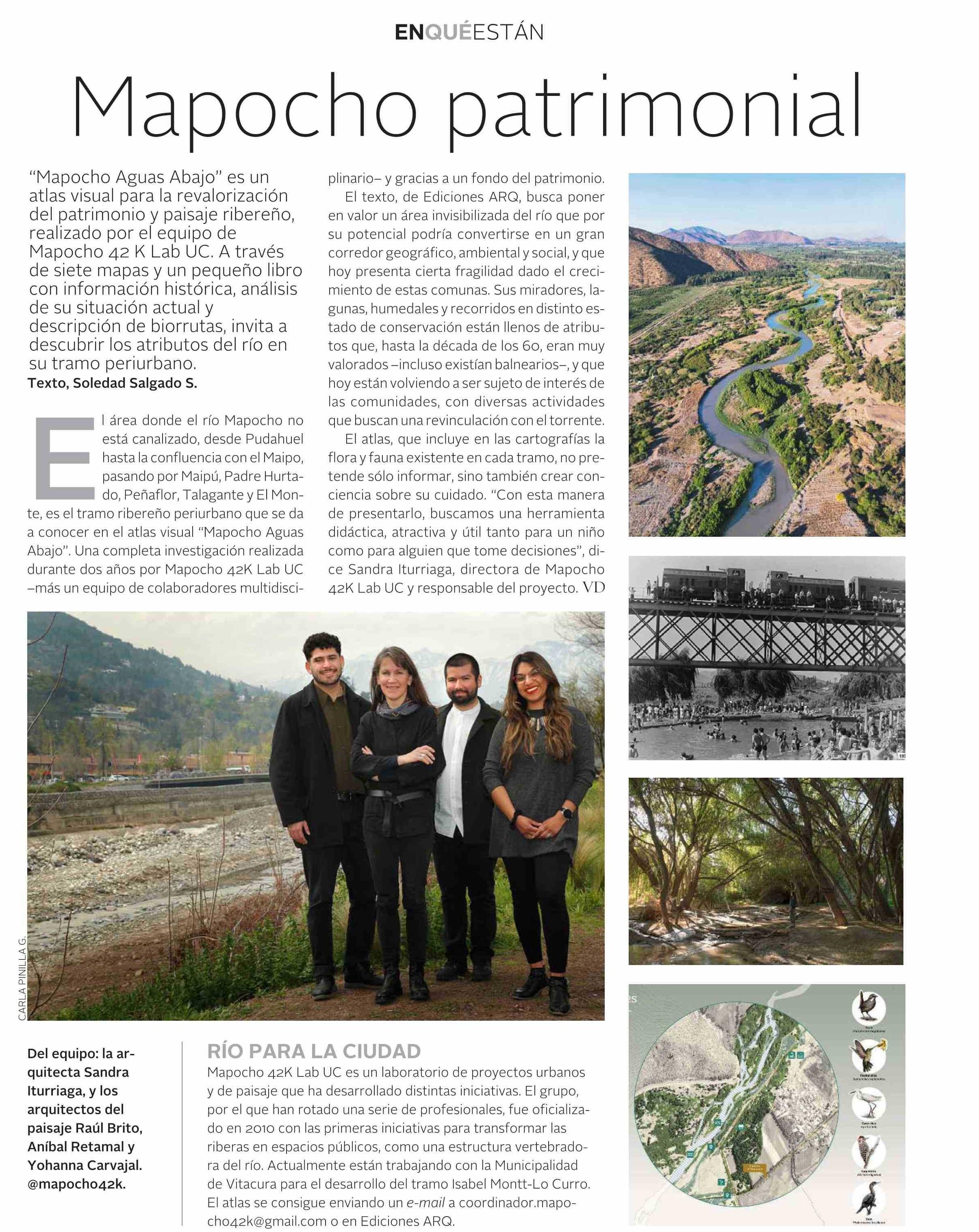 VD de El Mercurio destaca "Mapocho Aguas Abajo" de Ediciones ARQ, atlas visual para la revalorización del patrimonio y paisaje ribereño del río, realizado por el equipo de Mapocho 42K Lab UC. Habla Sandra Iturriaga, directora de Mapocho 42K Lab UC y responsable del proyecto.