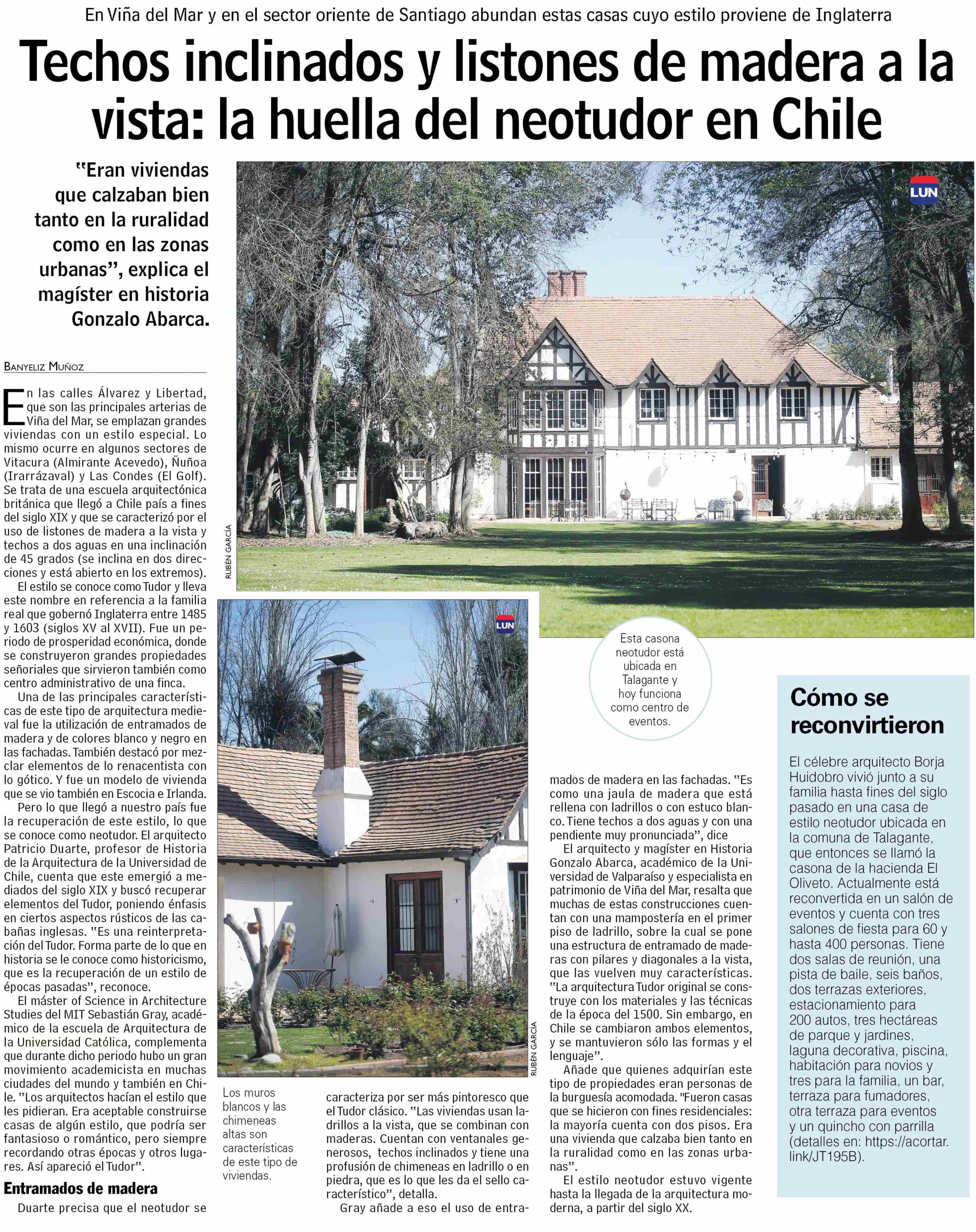Las Ultimas Noticias destaca las huellas del estilo neotudor en Chile: techos inclinados y listones de madera a la vista. Habla el académico Sebastián Gray.