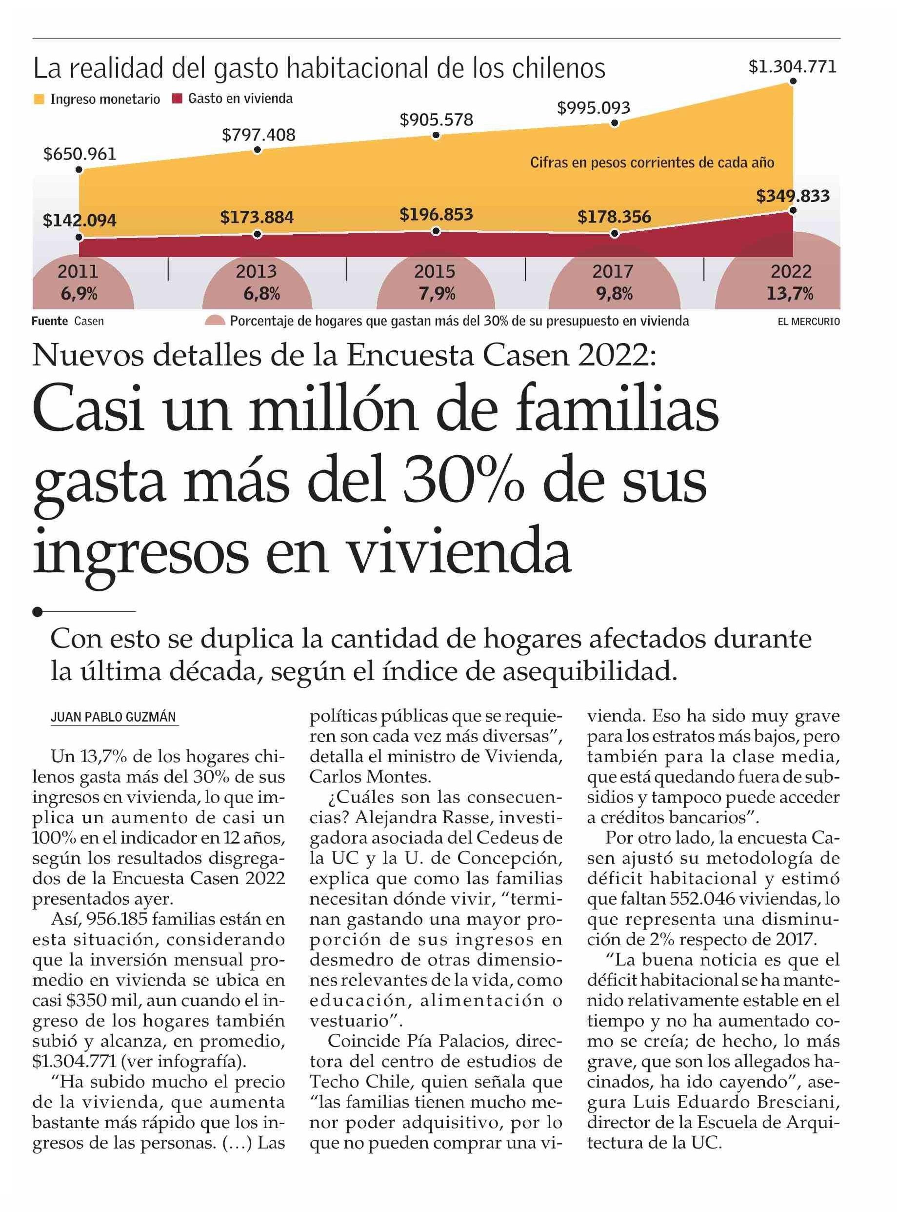 El Mercurio destaca que casi un millón de familias gasta más del 30% de sus ingresos en vivienda, según los resultados disgregados de la Encuesta Casen 2022 presentados ayer. Habla Alejandra Rasse, investigadora del Cedeus, y Luis Eduardo Bresciani, director de la escuela UC.