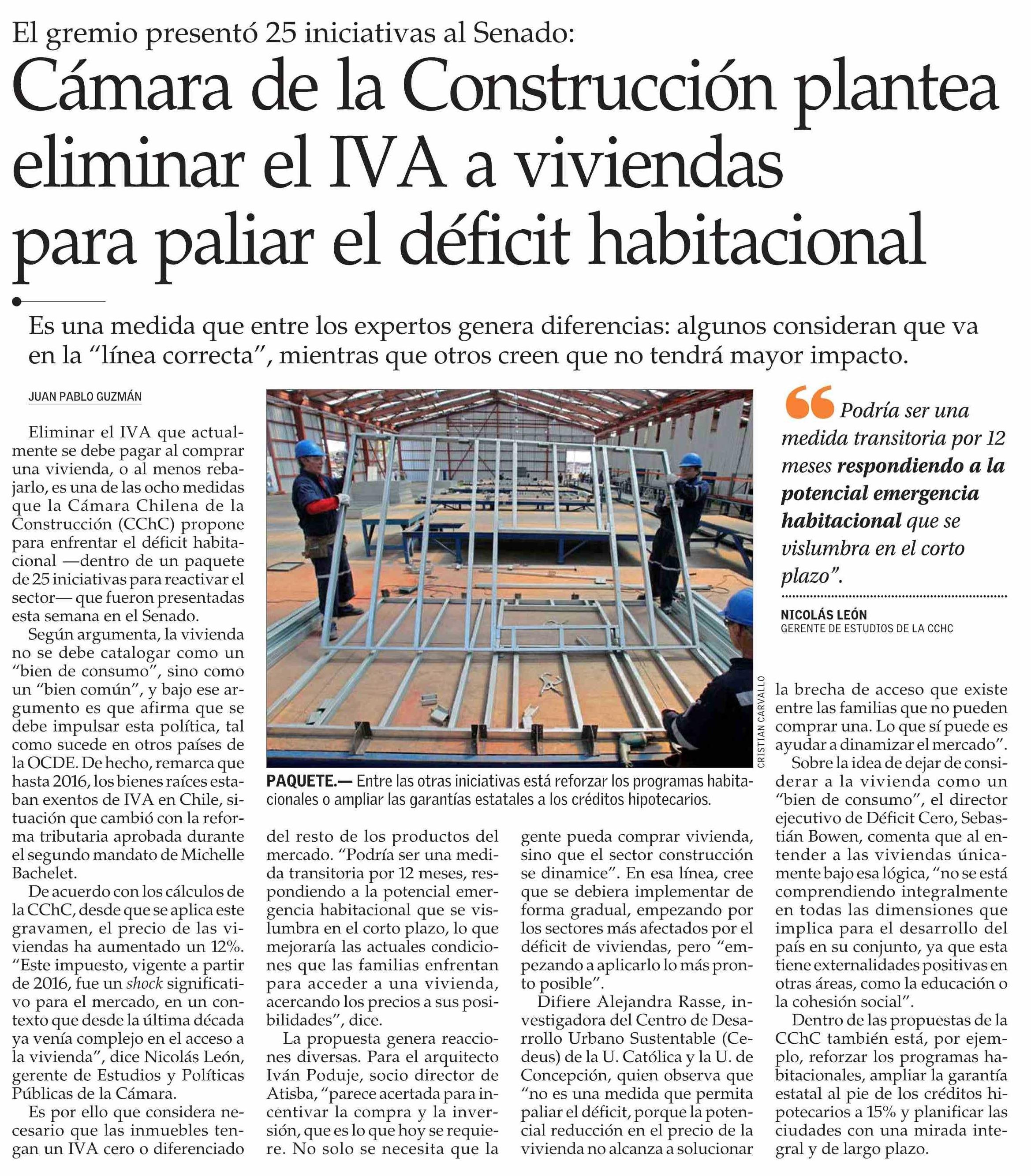 El Mercurio publica que eliminar el IVA que actualmente se debe pagar al comprar una vivienda, o al menos rebajarlo, es una de las ocho medidas que la Cámara Chilena de la Construcción propone para enfrentar el déficit habitacional. Fueron presentadas esta semana en el Senado. Habla la investigadora Alejandra Rasse.