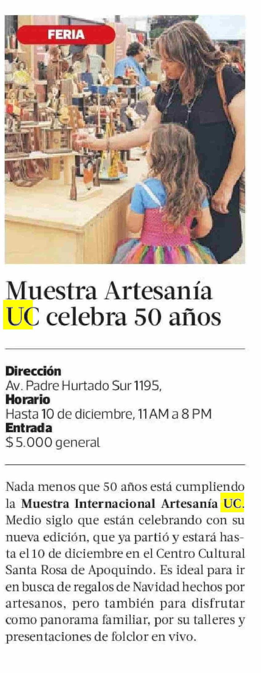 Medios destacan que la Muestra Artesanía UC celebra 50 años. Estará hasta el 10 de diciembre en el Centro Cultural Santa Rosa de Apoquindo. Habla Elena Alfaro, directora Programa Artesanía UC.