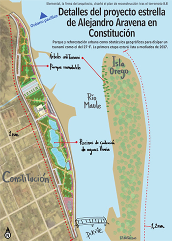Parque y reforestación urbana como obstáculos geográficos para disipar un tsunami como el del 27-F. La primera etapa estará lista a mediados de 2017.