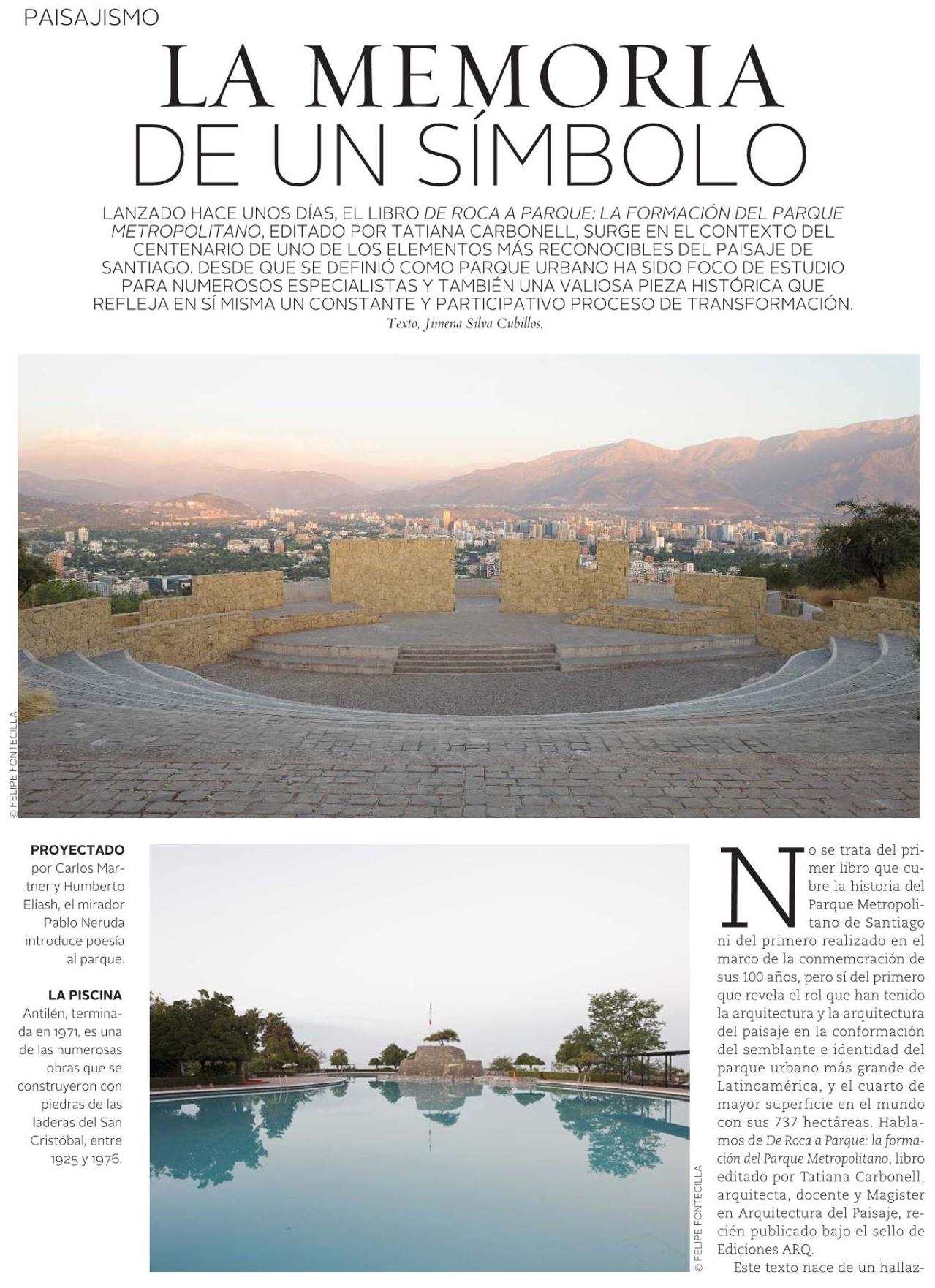 La memoria de un símbolo Detalles 24 Agosto 2021 Visto: 514 Tweet Revista VD de El Mercurio destaca lanzamiento del libro De Roca a Parque: la formación del Parque Metropolitano, editado por la profesora Tatiana Carbonell bajo el sello de Ediciones ARQ. + Revisa nota completa aquí.