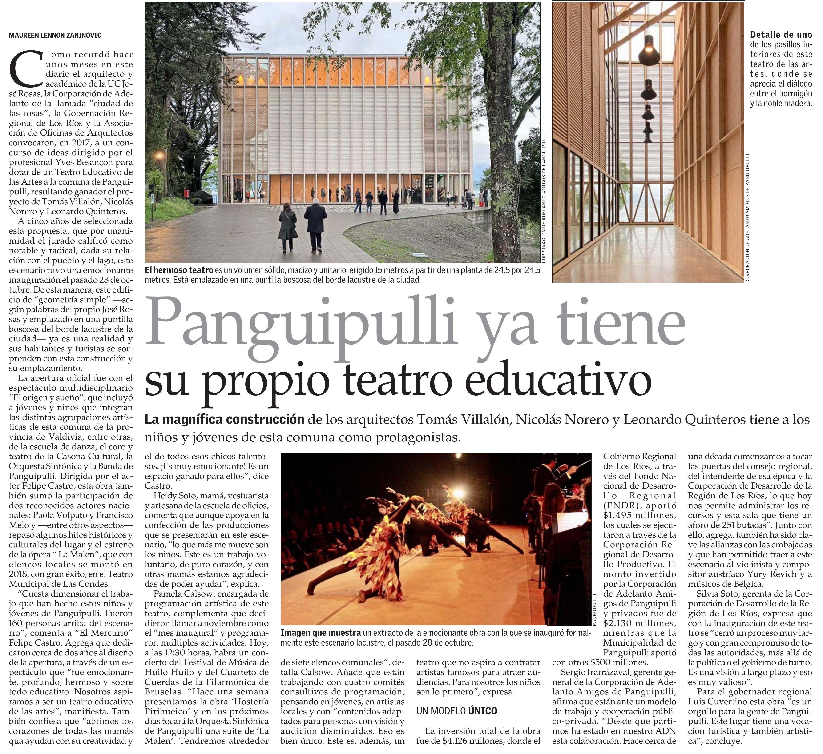 El Mercurio destaca la inauguración del Teatro Educativo de las Artes en Panguipulli, el pasado 28 de octubre. Se cita al académico UC José Rosas, que se refirió a la convocatoria por parte de la Corporación de Adelanto de la ciudad, la Gobernación Regional de Los Ríos y la Asociación de Oficinas de Arquitectos, de un concurso de ideas dirigido por el profesional Yves Besancon.
