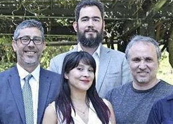 El académico Óscar Huerta, junto a los diseñadores y graduados MADA, Maximilian...